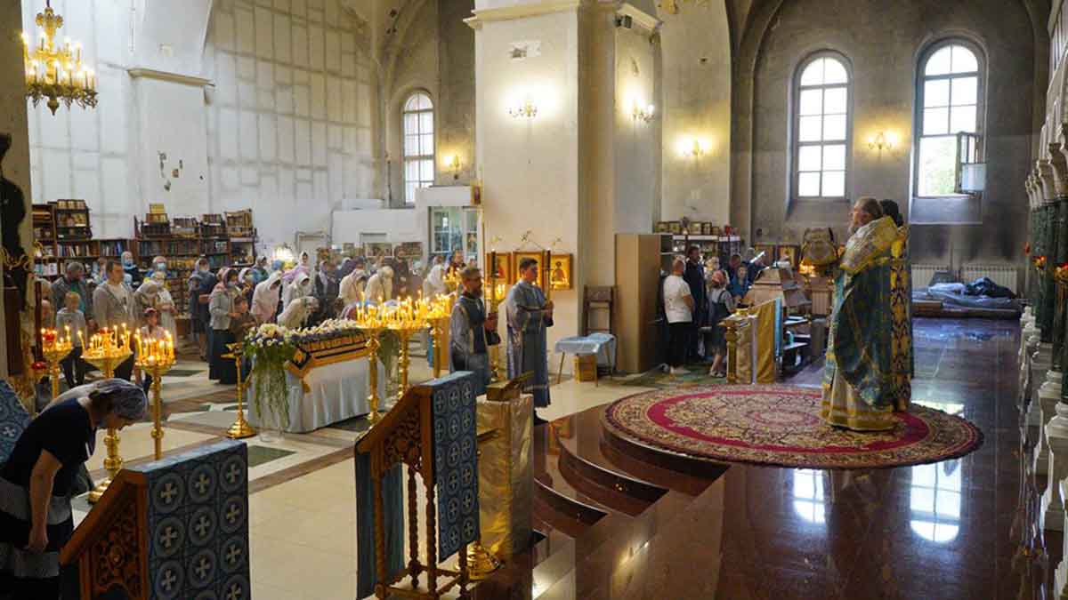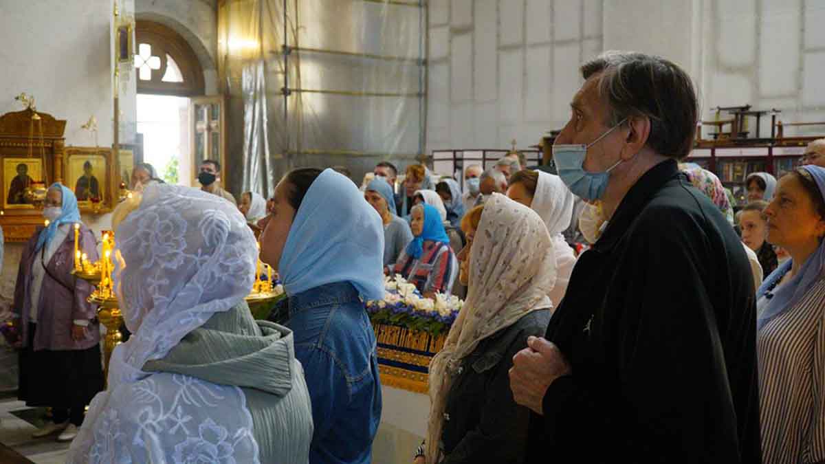 На утрени, под торжественное пение праздничного тропаря, был совершен вынос Плащаницы Божией Матери.