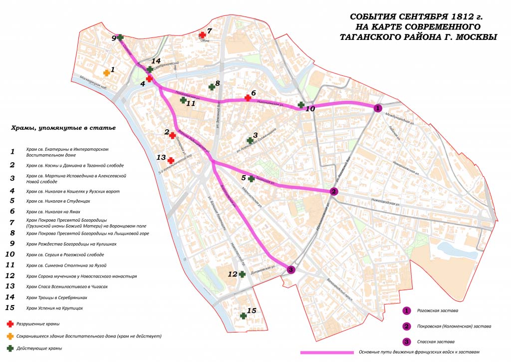 Современный Таганский район включает в себя не только историческую Таганку. Это и Алексеевская слобода, и Рогожская ямская слобода, и Солянка, и часть бывшего Московского уезда за Камер-Коллежским валом, в т. ч. Калитниковское кладбище. Так случилось, что в границах Таганки оказались заставы, через которые в 1812 г. проходили отступавшие из Москвы русские войска и преследовавшие их французы: Рогожская (начало Владимирского тракта), Покровская (Коломенская) и Спасская (дороги на Бронницы, Коломну, Рязань). У священнослужителей Таганки, оставшихся в Москве, практически не было шансов избежать встречи с французскими грабителями, наслышанными о якобы несметных богатствах, хранившихся в русских церквях. Путь французов от Кремля через Солянку вел к Яузскому мосту – и к церкви св. Николая в Кошелях (священник убит). От Яузского моста Николоямская улица ведет к Рогожской заставе мимо церкви прп. Сергия Радонежского в Рогожской слободе (священник убит). От Яузского моста через Швивую горку и Семеновскую (ныне Таганскую) улицу к Покровской заставе мимо церкви св. Николая на Студенце (священник убит). От Яузского моста по Воронцовской улице к Спасской заставе, Новоспасскому монастырю и церкви Сорока мучеников (священник убит).