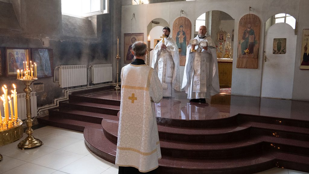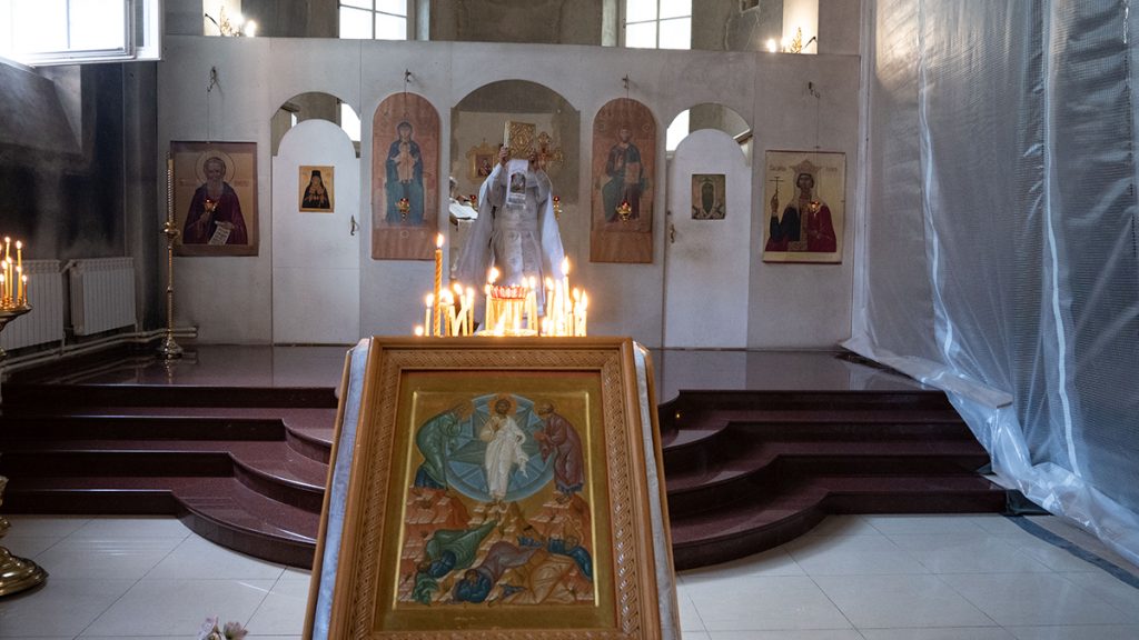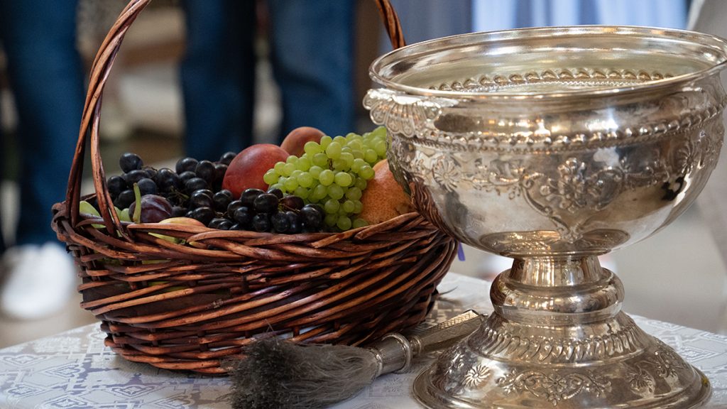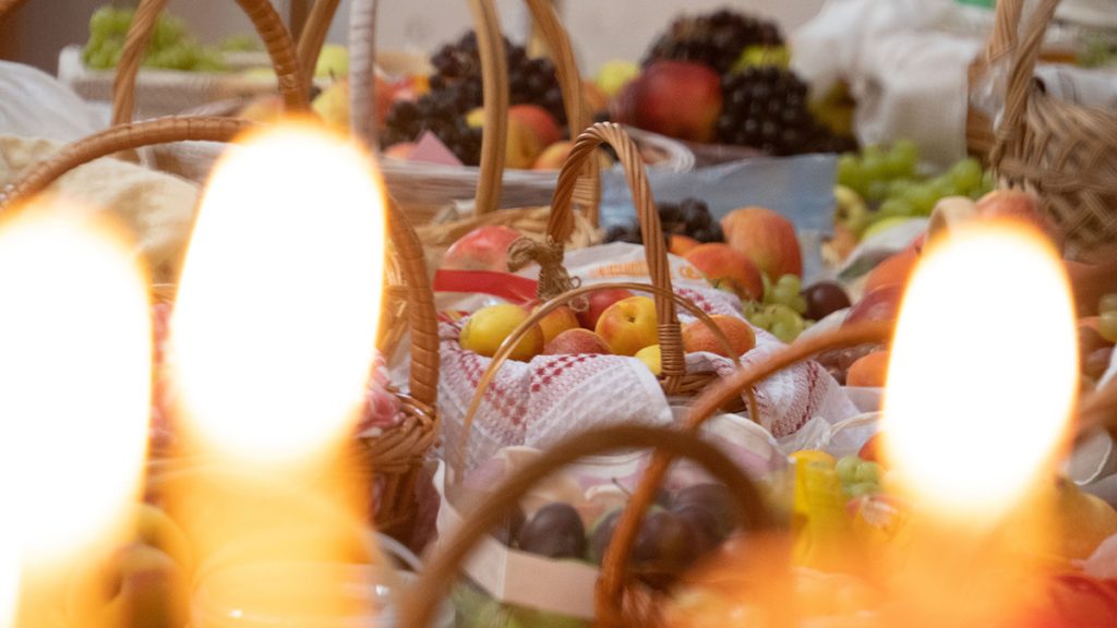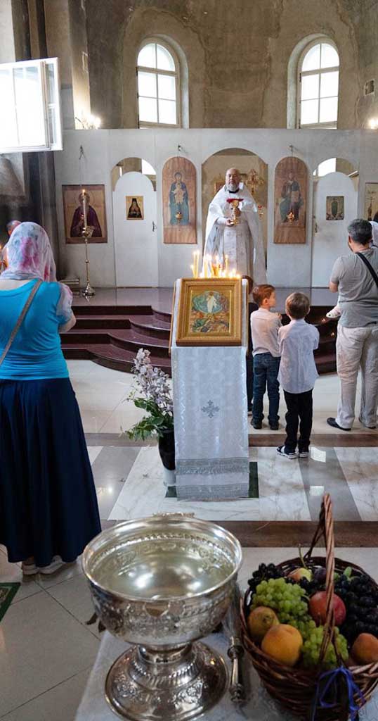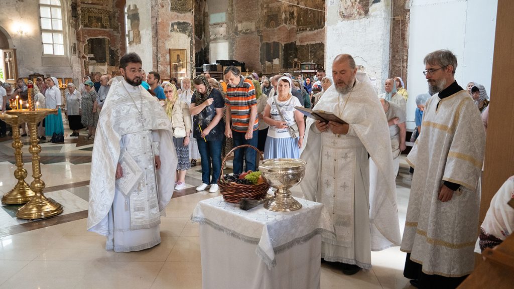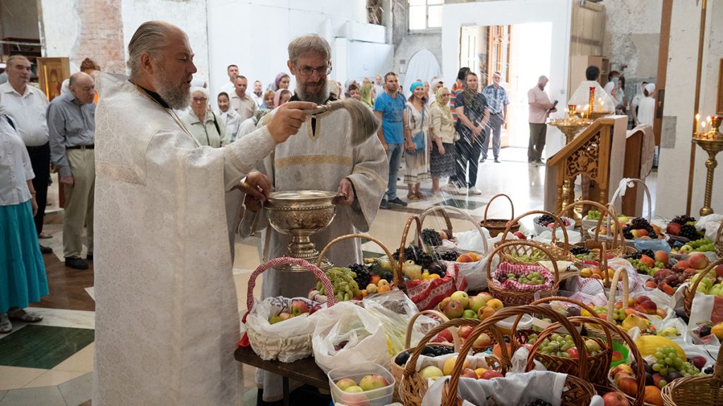 После заамвонной молитвы, при пении тропаря и кондака праздника, духовенством храма было совершено освящение принесенных плодов.